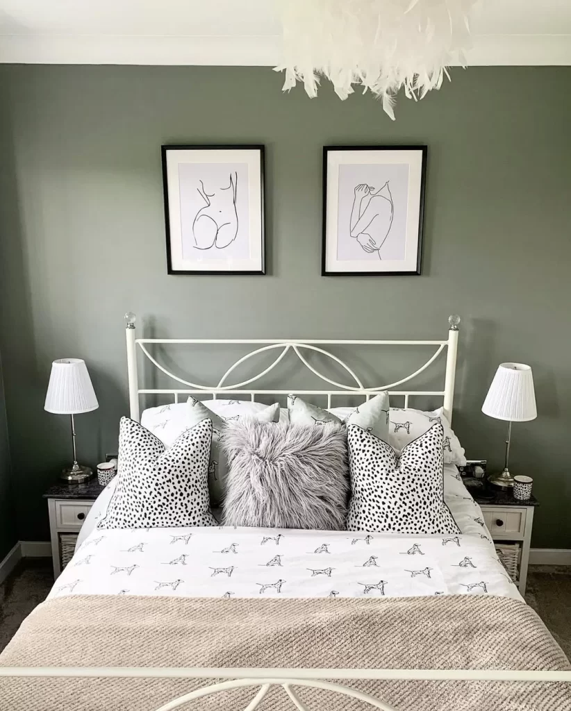 A serene bedroom featuring muted sage green walls creates a calming atmosphere. The white metal bed frame with curved details adds delicate charm, while black and white artwork provides graphic contrast. Polka dot pillows and minimal line art create a playful yet sophisticated aesthetic, enhanced by the white feather chandelier above.