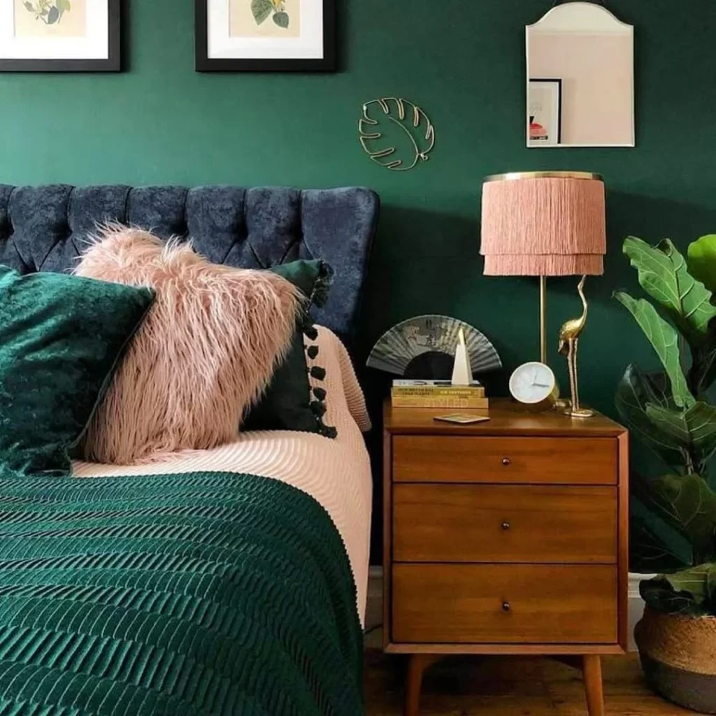 This striking room features a rich emerald green accent wall paired with a navy blue tufted sofa. The space combines modern and bohemian elements with a coral-pink fringed lampshade, mid-century wooden nightstand, and lush greenery. The textural contrast between the smooth velvet sofa and fluffy throw pillows creates visual interest, while botanical prints on the wall reinforce the natural theme.