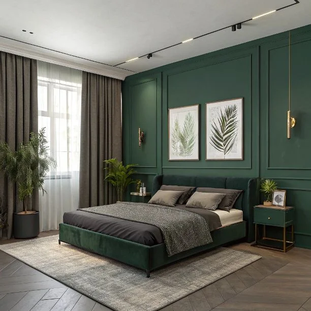 This contemporary bedroom makes a bold statement with rich forest green paneled walls and built-in nightstands. The room features a platform bed with dark bedding, botanical prints, and brass accent lighting. Track lighting on the ceiling adds a modern touch, while the darker green creates a more dramatic, cocoon-like atmosphere.