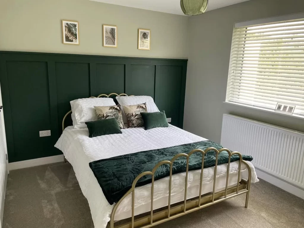 This bedroom showcases a sophisticated approach to green decor with a deep forest green paneled accent wall behind the bed. The brass bed frame creates an elegant contrast, while white bedding keeps the look fresh and clean. The tropical-themed throw pillows and botanical artwork above the bed reinforce the natural theme, creating a cohesive and calming atmosphere.
