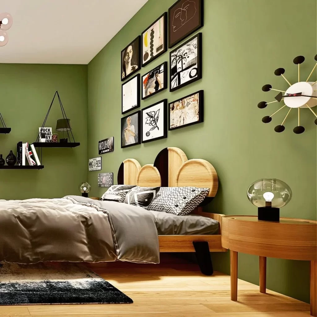 The first bedroom features a vibrant olive green accent wall paired with light wood furniture and flooring. A curated gallery wall of black-framed artwork creates visual interest above the bed, which has a distinctive curved wooden headboard. The space combines modern styling with mid-century elements, complemented by a geometric sunburst clock and sleek pendant lighting.