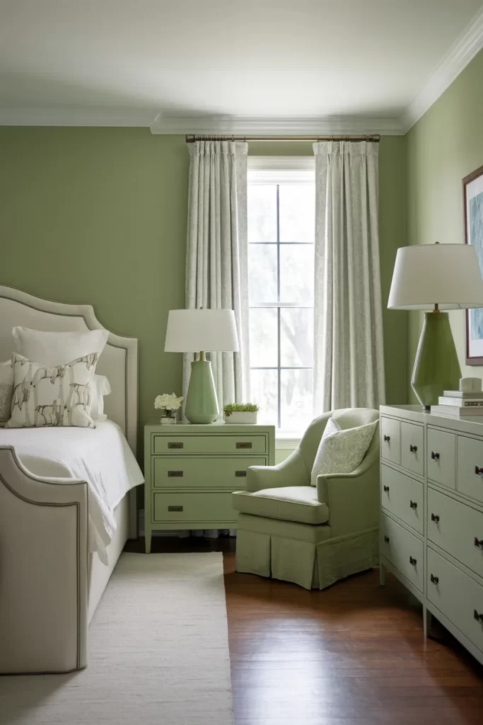 This bedroom embraces a full green color story with sage walls, a green upholstered chair, green nightstand, and coordinating lamp bases. The space demonstrates how different shades of green can work harmoniously together, while white bedding and curtains prevent the room from feeling overwhelming. A large dresser provides ample storage while maintaining the cohesive color scheme.