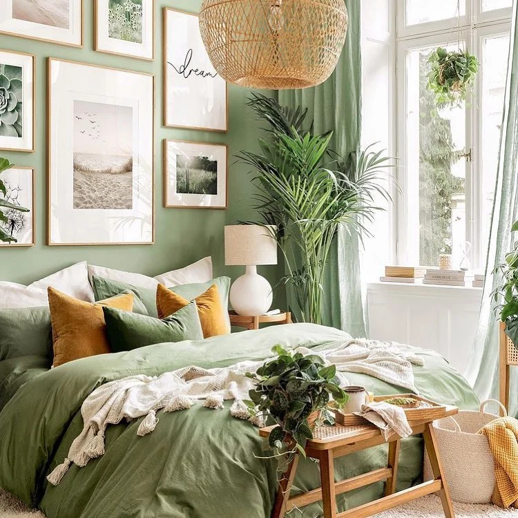 This room combines sage green walls with abundant natural elements – multiple plants, natural fiber lighting, and a gallery wall of nature photographs. The mustard yellow accent pillows provide a complementary color pop. The overall aesthetic is fresh and organic, emphasizing the connection between green tones and nature.