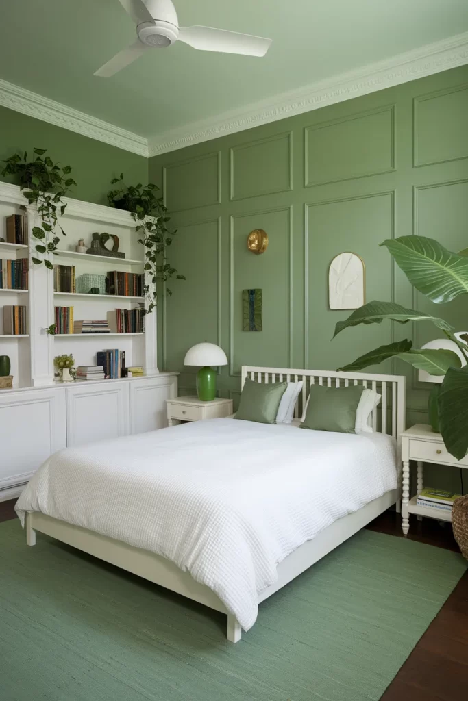 This sophisticated bedroom showcases sage green walls with elegant paneled wainscoting painted in the same hue. A white wooden bed frame anchors the space, complemented by green throw pillows and white bedding. The room features a white built-in bookshelf filled with colorful books, trailing green plants, and a white ceiling fan for comfort. The green area rug and natural light from the window create a calming, library-like atmosphere.
