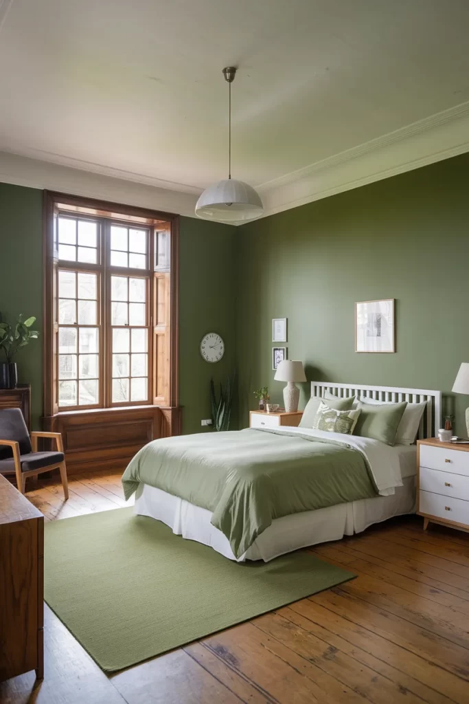 Featuring warm sage green walls with beautiful natural wood window frames, this bedroom has a distinctly Scandinavian feel. The simple white bed frame, minimal nightstands, and natural wood floors create a clean, uncluttered aesthetic. A vintage wooden chair and pendant light add character while maintaining the room’s serene, minimalist appeal.