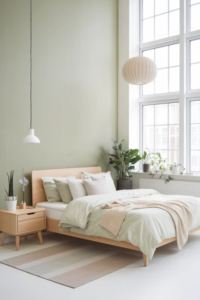 This bright, airy bedroom uses a soft mint green on the walls paired with clean-lined light wood furniture. Large windows flood the space with natural light, while minimal styling focuses on functionality and simplicity. The neutral bedding and natural fiber rug maintain the serene, uncluttered Scandinavian aesthetic.