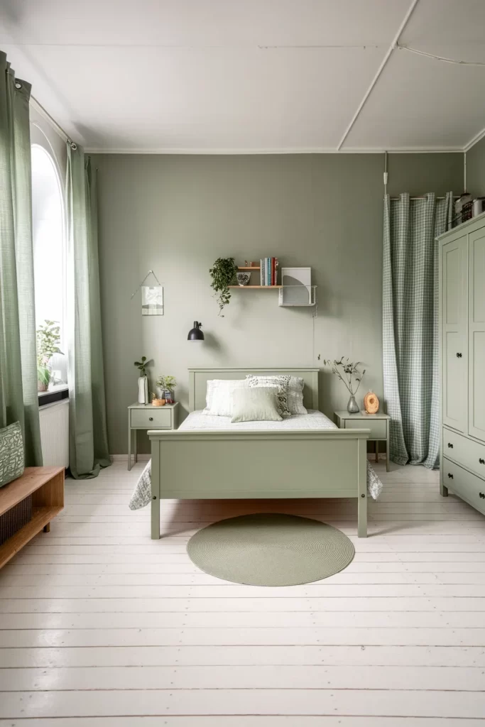This Nordic-inspired children’s bedroom features sage green walls with white trim and painted white floorboards. A green painted bed frame matches the wall color, while green checkered curtains add pattern and texture. The room includes practical storage solutions like wall-mounted shelving and maintains the clean, minimalist aesthetic typical of Scandinavian design. A small green circular rug completes the cohesive color scheme.