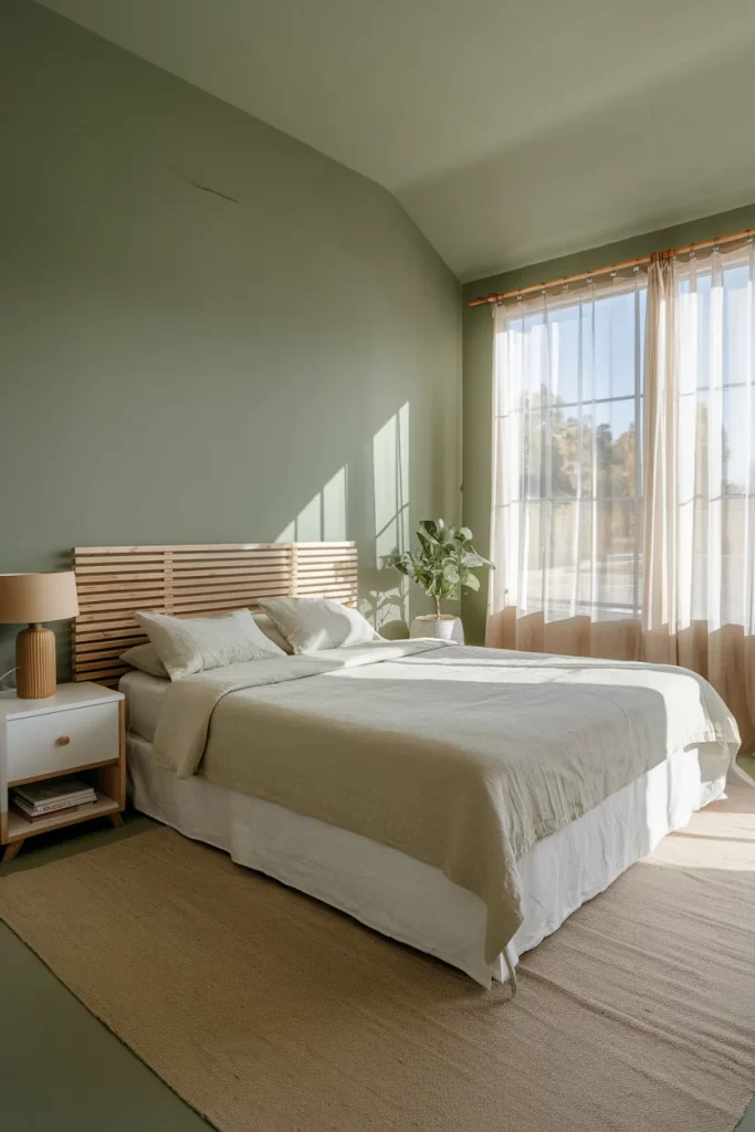 A peaceful bedroom with soft sage green walls emphasizes natural materials through a horizontal wood slat headboard and linen bedding. Abundant natural light from large windows and minimal styling create a spa-like atmosphere. The neutral color palette and clean lines promote rest and relaxation.