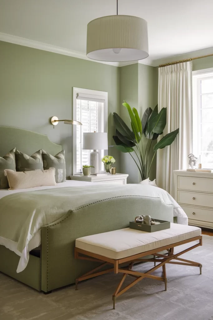 This elegant bedroom showcases soft sage green walls paired with a luxurious upholstered headboard in matching green tones. The space features layered green bedding, a brass and cream bench at the foot of the bed, and a large bird of paradise plant as a natural focal point. The neutral curtains and white nightstand create a balanced, serene atmosphere perfect for relaxation.