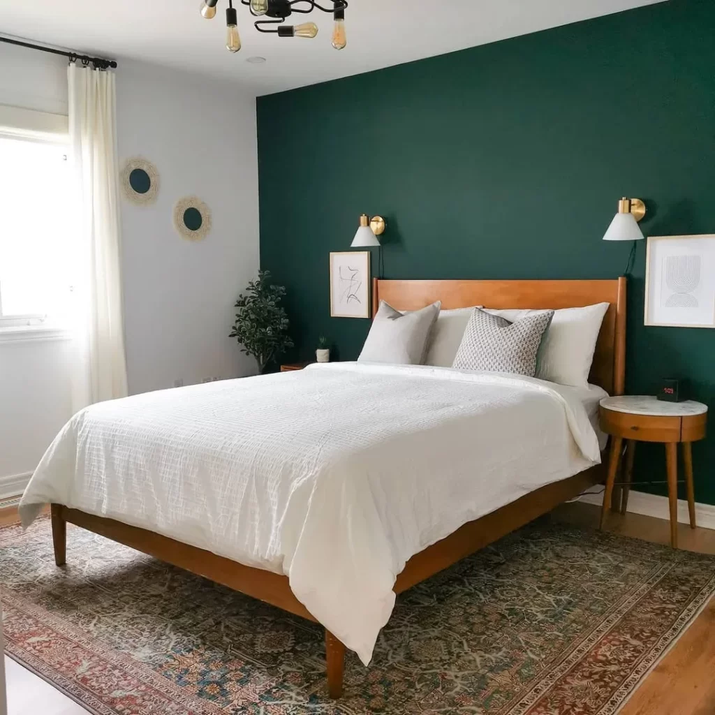 This modern bedroom makes a bold statement with a deep forest green accent wall behind the bed. The warm wood bed frame and matching nightstands provide natural contrast, while white bedding keeps the look fresh and clean. The vintage-style area rug and black track lighting add character and functionality to this well-balanced space.
