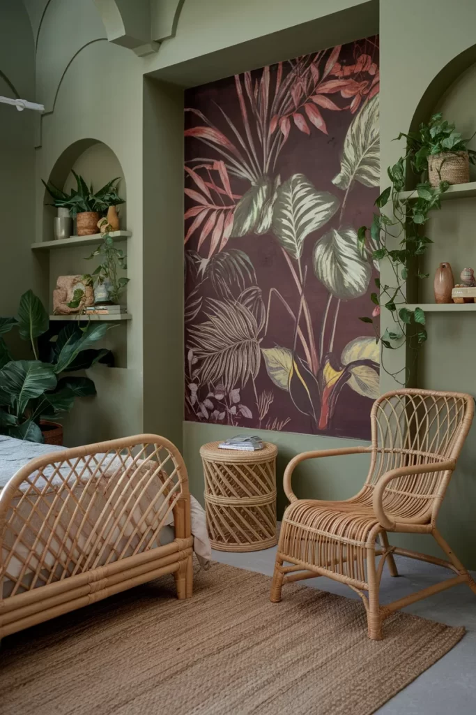 An artistic space featuring sage green walls and architectural arched shelving creates display areas for books and plants. Natural rattan furniture and a dramatic botanical wallpaper mural in burgundy tones add tropical flair. The combination of built-in storage and natural materials creates an organized yet organic feeling.