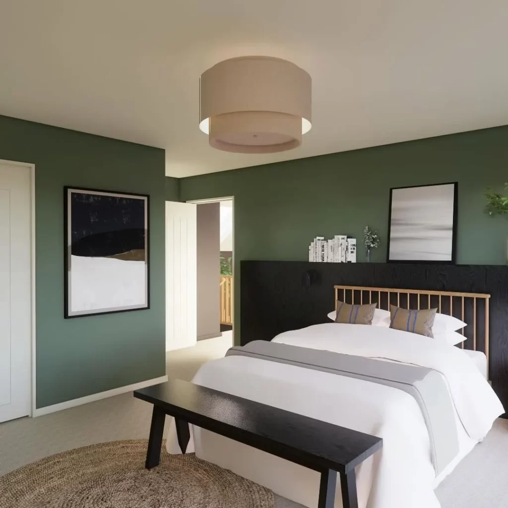 The most subtle approach shown, this bedroom uses a very pale sage green as an accent wall. Botanical artwork and light wood furniture create a Scandinavian-influenced look. The woven pendant light and minimal styling maintain the serene, uncluttered aesthetic.