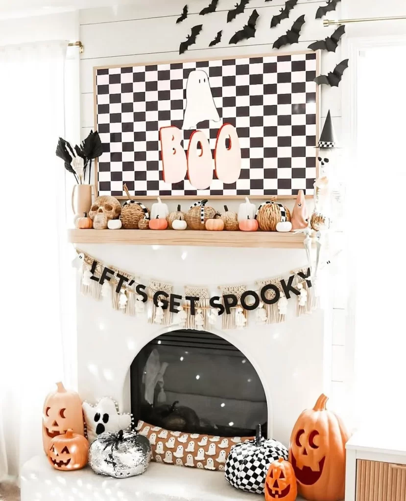 This modern Halloween look features a striking black and white checkered backdrop that makes a bold statement. Paper bats fly across white shiplap walls while the wooden mantel displays an eclectic mix of natural and Halloween elements. A “BOO” sign with ghost imagery serves as the focal point, complemented by neutral pumpkins and woven baskets. The “LET’S GET SPOOKY” tassel banner adds playful typography to the design.