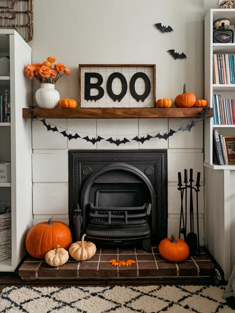 This traditional approach features a “BOO” sign as the centerpiece, surrounded by classic orange pumpkins and black bat decorations. The white subway tile fireplace provides a clean backdrop for the bold Halloween colors, while the combination of traditional elements creates a timeless Halloween look that’s fun without being too scary.