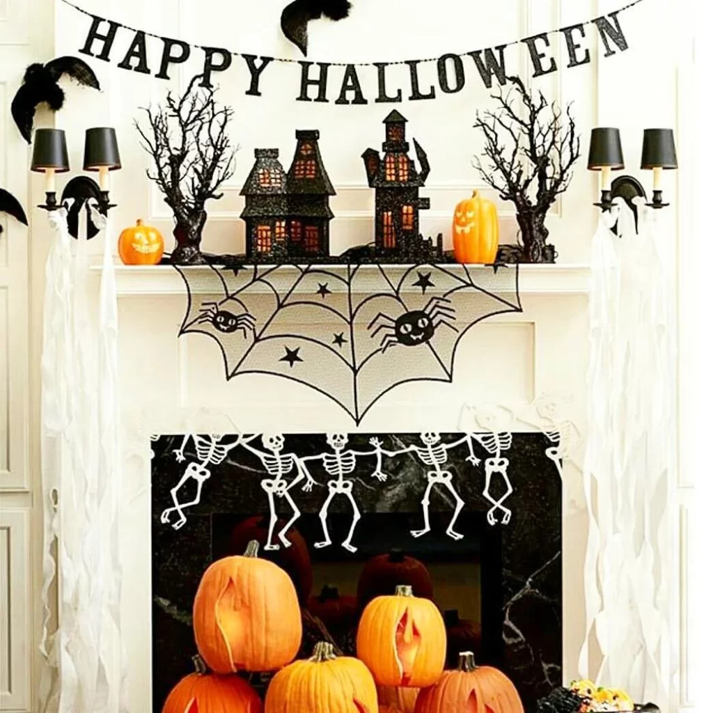 A “HAPPY HALLOWEEN” banner stretches across this traditional white fireplace, which features a miniature Halloween village on the mantel. Spooky houses with glowing windows, bare trees, and jack-o’-lanterns create a classic trick-or-treat neighborhood scene. A large spider web spans the fireplace opening, decorated with small spiders, while skeleton garland dances inside the firebox. Ravens perched on the sides add to the authentic Halloween atmosphere.