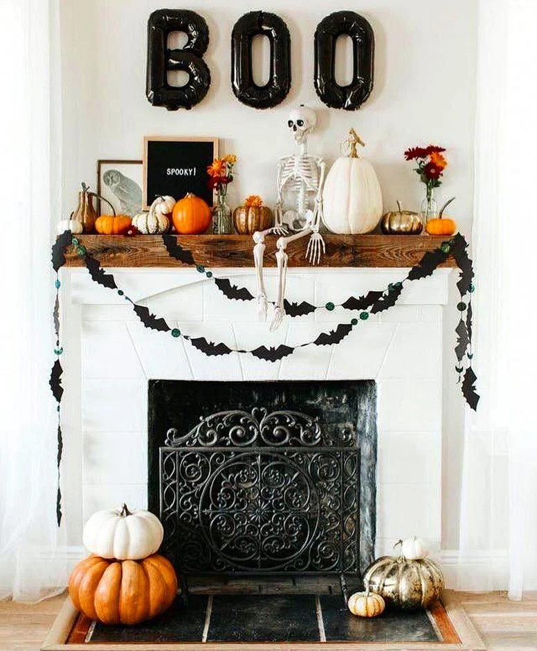 A white fireplace creates the backdrop for this traditional Halloween scene featuring large black “BOO” balloon letters above the mantel. The wooden mantel shelf showcases autumn pumpkins, flowers, and a prominent skeleton figure positioned among the decorations. Black paper bat garland drapes elegantly across the fireplace, while various pumpkins in white, orange, and metallic finishes are arranged on the hearth. This strikes a perfect balance between spooky and sophisticated.