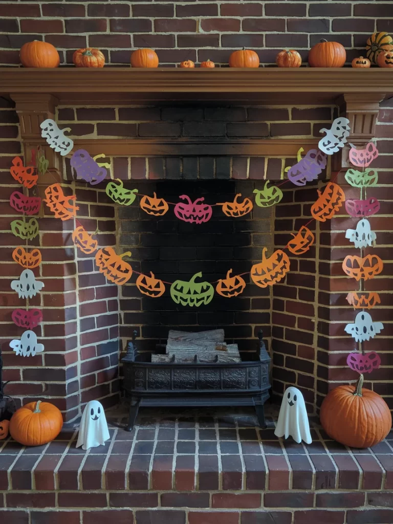 The final image shows a brick fireplace decorated with vibrant paper crafts, including colorful jack-o’-lantern garlands in multiple hues and white ghost decorations. This playful approach is perfect for families with children, featuring bright, cheerful Halloween colors rather than traditional spooky themes. The handmade paper decorations add a personal, crafty touch to the seasonal display.