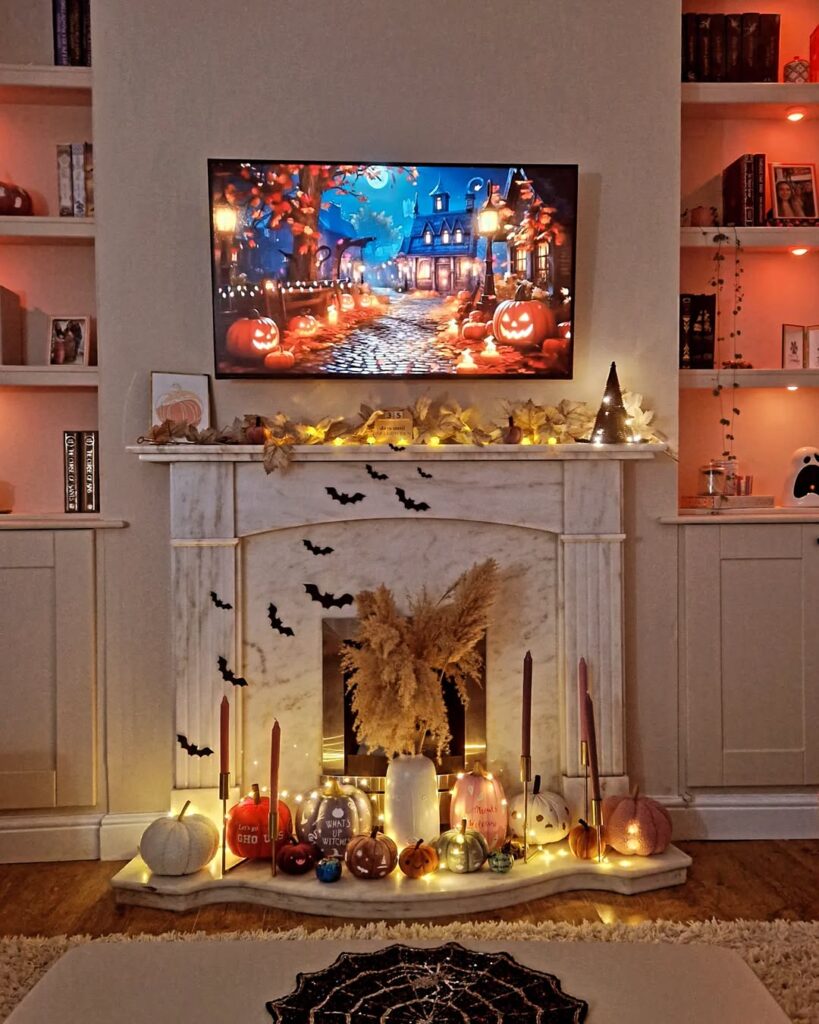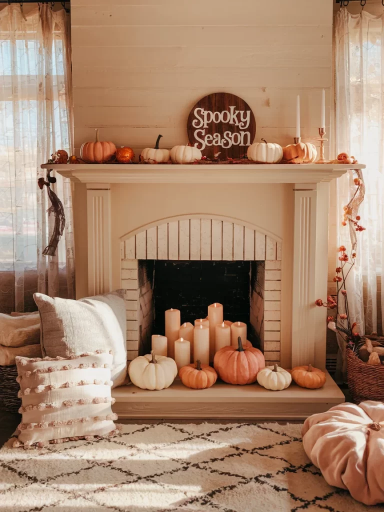 This setup embraces the “Spooky Season” theme with warm, inviting autumn colors. The white fireplace mantel displays a rustic wooden sign surrounded by various pumpkins in cream and orange tones. Candles fill the firebox, while autumn leaves and cozy textiles add warmth. The overall feel is more harvest-focused than scary.