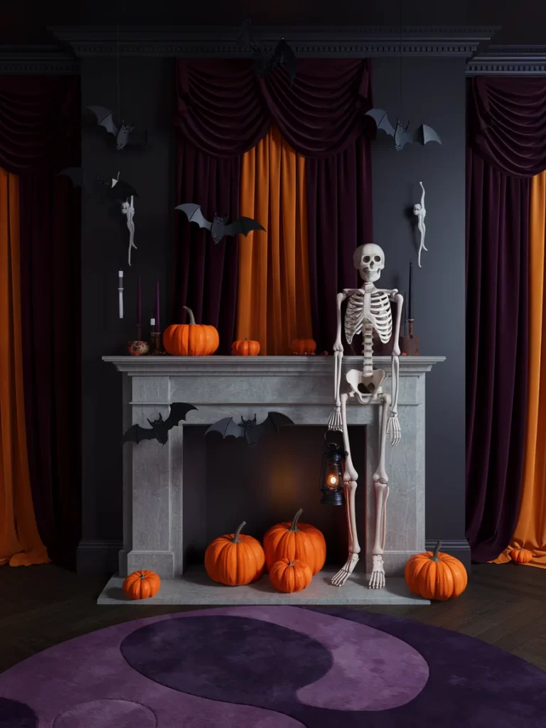 This sophisticated setup embraces dark Halloween elegance with deep purple velvet curtains and dramatic lighting. A life-sized skeleton stands beside a gray fireplace mantel, which displays orange pumpkins and gothic accessories. Gray paper bats scattered on dark walls, along with skeleton silhouettes, create a haunted mansion atmosphere. The rich color palette of purple, orange, and gray adds luxury to the spooky theme.