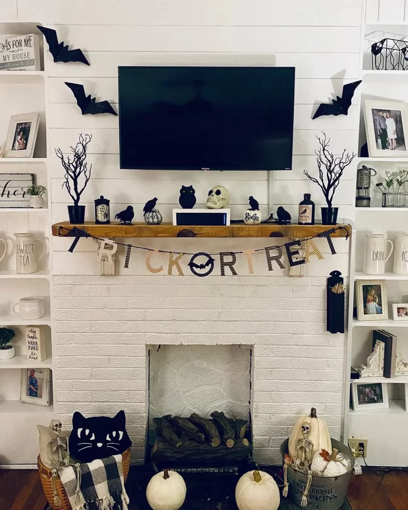 A white shiplap fireplace wall serves as the backdrop for this chic Halloween display. Black bat cutouts fly across the wall while the wooden mantel holds “TRICK OR TREAT” banner bunting. The styling includes black ravens, skulls, bare black branches, and white pumpkins, creating an elegant gothic aesthetic that’s perfect for adult Halloween entertaining.
