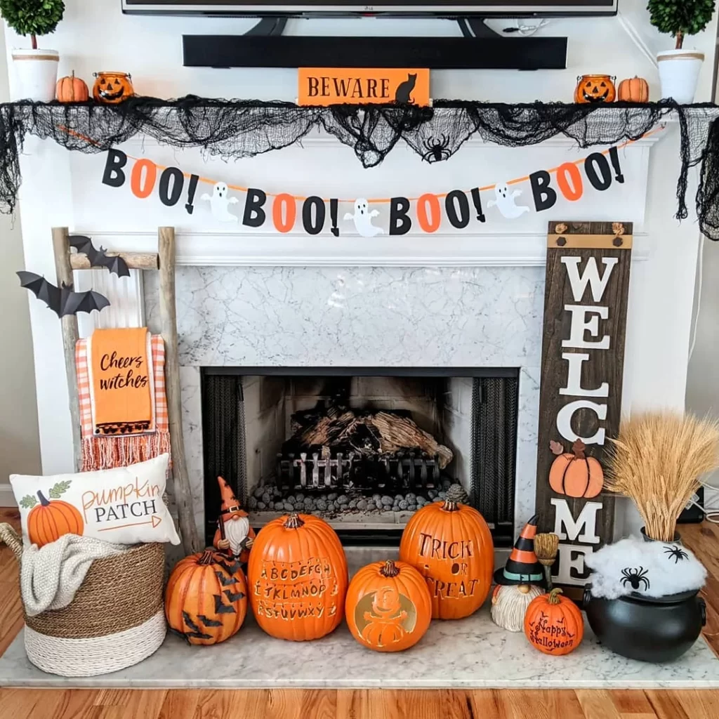 A white marble fireplace becomes the centerpiece for this cheerful Halloween display. Black spiderweb garland drapes elegantly across the mantel, while a “BOO!” banner with ghost elements spans the opening. The mantel features a “BEWARE” sign surrounded by mini pumpkins and decorative elements. A rustic wooden “WELCOME” sign, carved jack-o’-lanterns, and cozy fall accessories create a perfect balance of spooky and inviting.