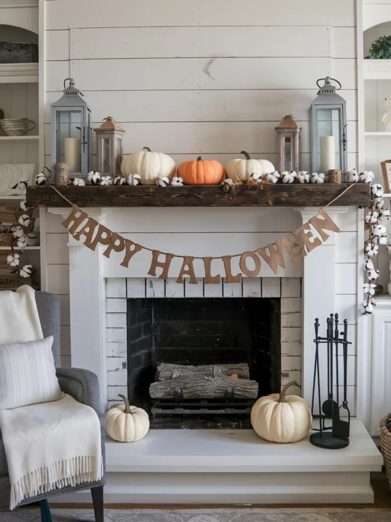 A white farmhouse-style fireplace features a “HAPPY HALLOWEEN” burlap banner and cotton stem garland for a rustic autumn look. Gray lanterns and pumpkins in neutral tones create a sophisticated seasonal display that’s more harvest-focused than frightening, perfect for family-friendly Halloween decorating.