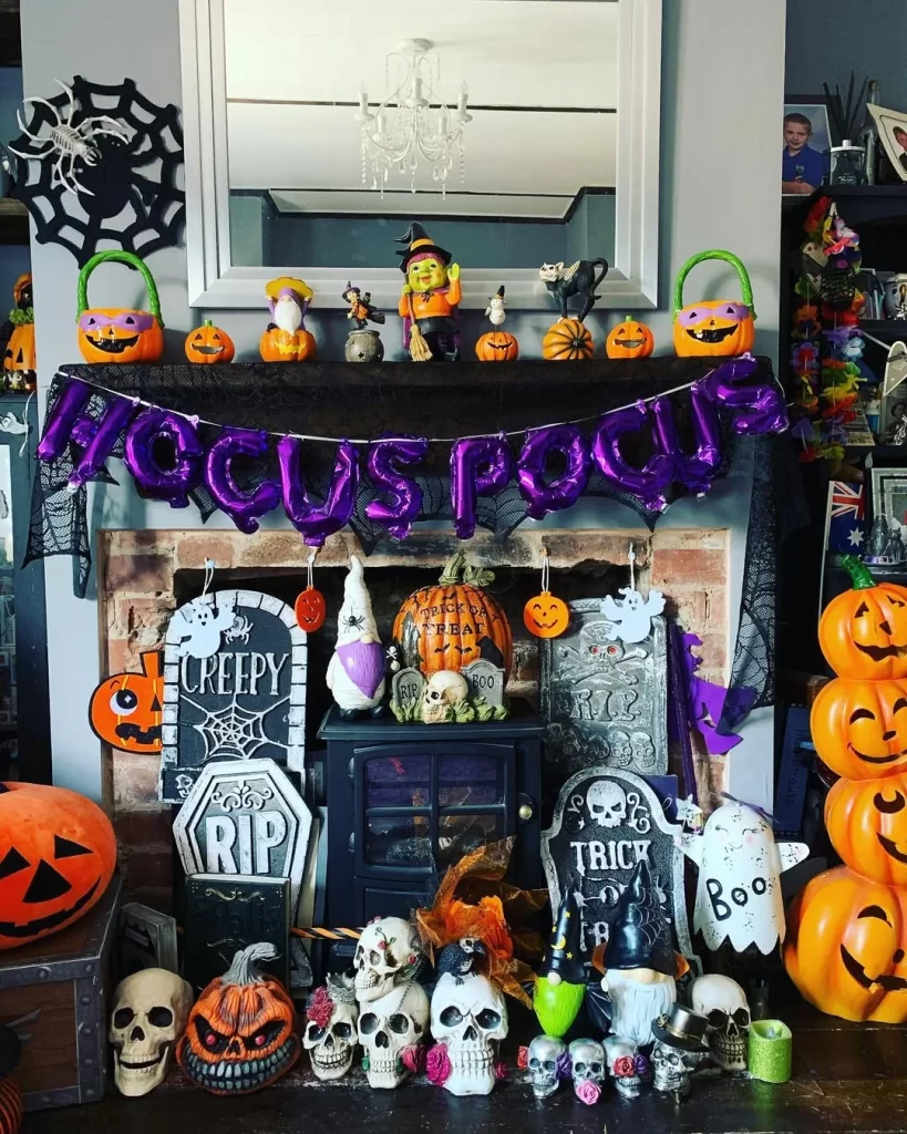 This bold display embraces “more is more” philosophy with a fireplace completely packed with Halloween treasures. Purple foil “HOCUS POCUS” balloons hang above the mantel, which overflows with jack-o’-lanterns, skulls, tombstones, and Halloween signs. A black spider web decoration hangs to the side while the hearth is filled with additional skulls, bones, and spooky props. This intense display is perfect for those who want their Halloween decorations to make a dramatic statement.