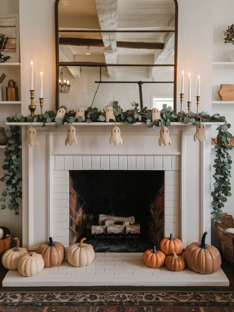 A white fireplace with built-in shelving showcases a more subtle Halloween approach. Cute white ghost garland hangs from eucalyptus greenery, while brass candlesticks add sophistication. Various pumpkins in neutral tones fill the hearth, and the overall palette stays light and elegant rather than dark and spooky.