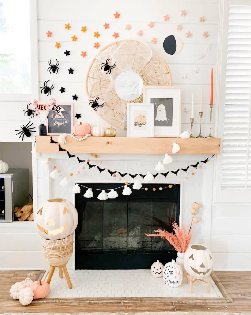 This contemporary Halloween design features a clean white fireplace with neutral tones and natural textures. Paper stars in gradient orange create a constellation effect on the wall, while black paper spiders and bats add Halloween elements. The wooden mantel displays small pumpkins, framed Halloween prints, and brass candlesticks. White tassel and bat garland spans the fireplace opening, with white jack-o’-lanterns and a wicker basket completing the minimalist boho aesthetic.
