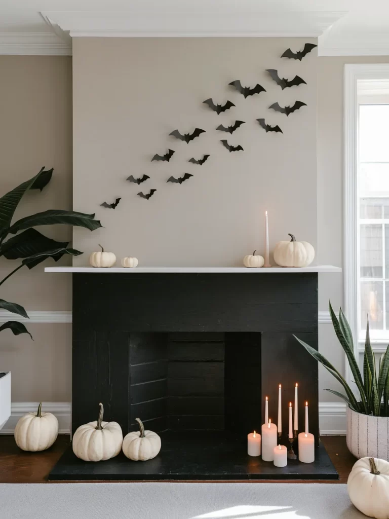 A sleek black fireplace serves as the backdrop for this contemporary Halloween display. A flock of black paper bats appears to fly up and across the neutral wall, while white candles of varying heights fill the firebox for ambient lighting. White pumpkins on the mantel and hearth maintain the clean, monochromatic aesthetic with subtle Halloween touches.