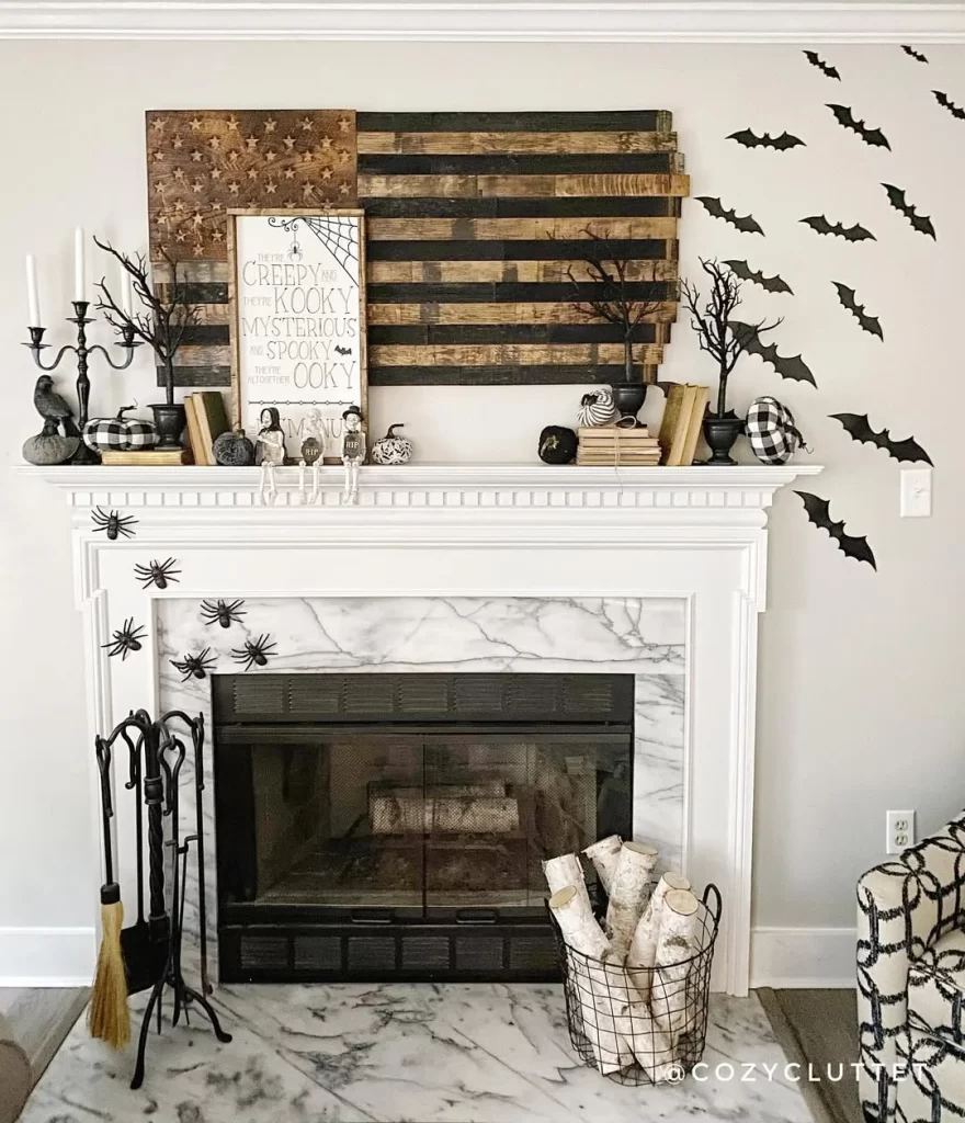 This sophisticated approach features a white fireplace with clean lines and understated Halloween touches. A rustic wood and metal American flag serves as the backdrop, while the mantel displays carefully curated items including books, black branches, small pumpkins, and a Halloween word art sign. Black paper bats flutter across the white shiplap wall, and spiders crawl down the fireplace surround for subtle spooky details.