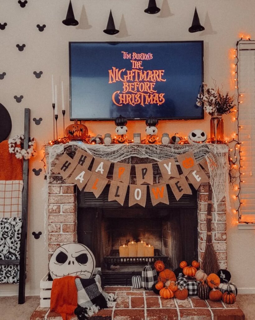 This themed Halloween display centers around Tim Burton’s “The Nightmare Before Christmas” with the movie playing on the mounted TV. The brick fireplace features a burlap “HAPPY HALLOWEEN” banner, while the mantel showcases Jack Skellington merchandise and Halloween decorations. Mickey Mouse witch hats scattered on the walls add a Disney touch, with orange string lights, candles in the firebox, and an abundance of pumpkins creating a cozy yet spooky atmosphere.