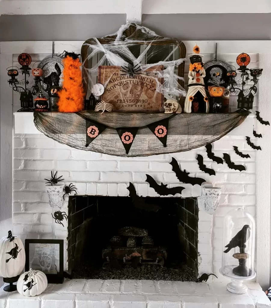 This unique approach centers around a vintage-style Ouija board as the main focal point on a white brick fireplace. The mantel is loaded with Halloween treasures including skeleton hands, ravens, orange and black decorations, and mystical elements. Fake spider webs, “BOO” banner bunting, and scattered bats throughout create an authentic haunted house vibe with supernatural undertones.