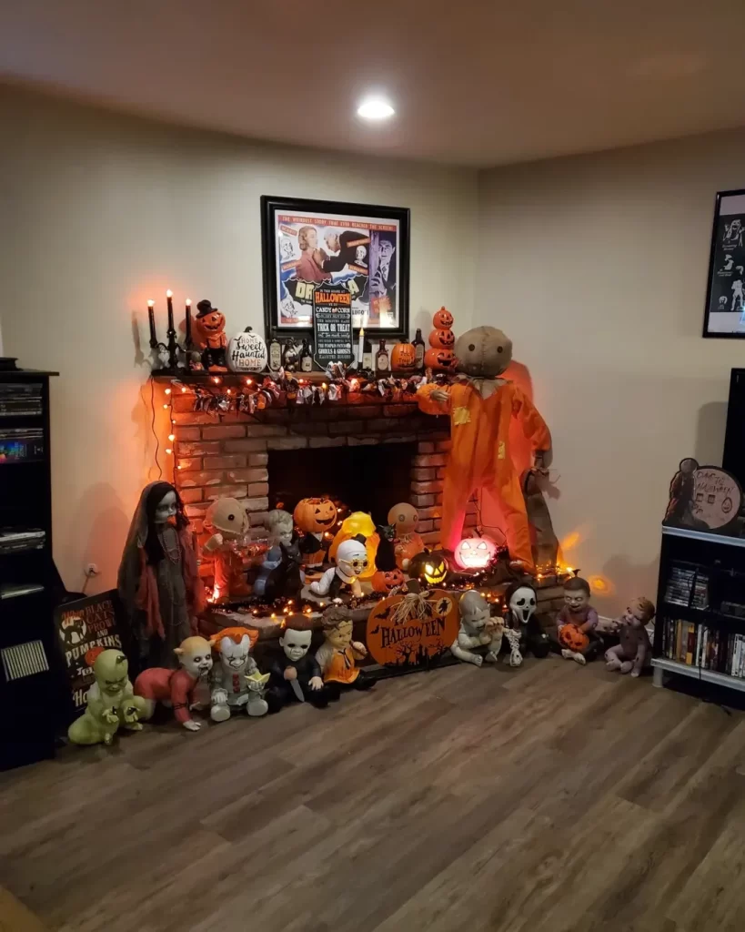 This impressive display takes Halloween decorating to the extreme with a brick fireplace completely filled with spooky collectibles. The mantel features horror movie props, skulls, jack-o’-lanterns, and character figures, all illuminated with orange lighting. A vintage horror movie poster serves as wall art, while the hearth overflows with additional Halloween decorations, dolls, and creatures. Orange string lights throughout create an eerie glow perfect for serious Halloween fans.