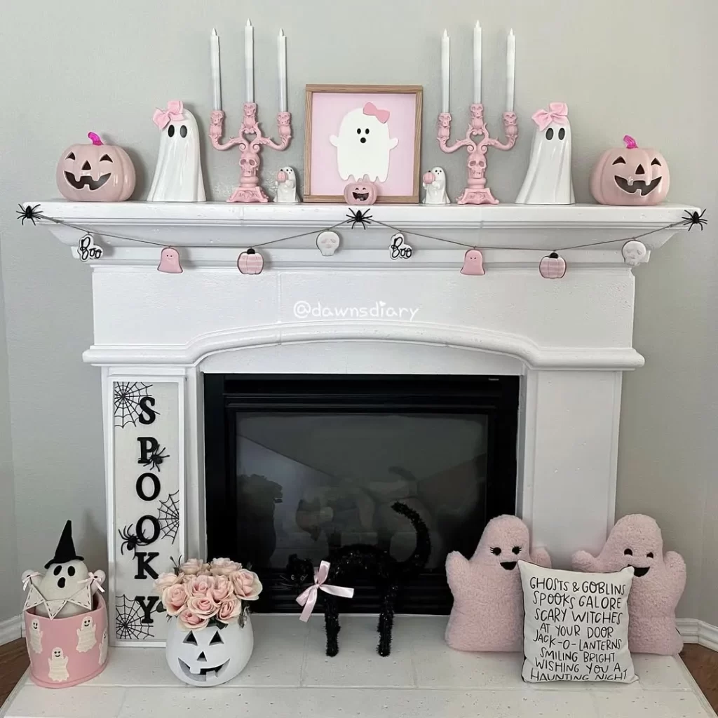 This delightfully unexpected take on Halloween features a soft pink and white color palette. The white fireplace mantel displays pink jack-o’-lanterns, white ghosts, and rose-colored candelabras with white candles. A framed ghost artwork with a pink bow serves as the centerpiece, while a “SPOOKY” vertical sign with spider web details adds Halloween charm. Pink and white garland with small Halloween motifs completes this feminine, Instagram-worthy Halloween look that’s perfect for those who prefer cute over scary.