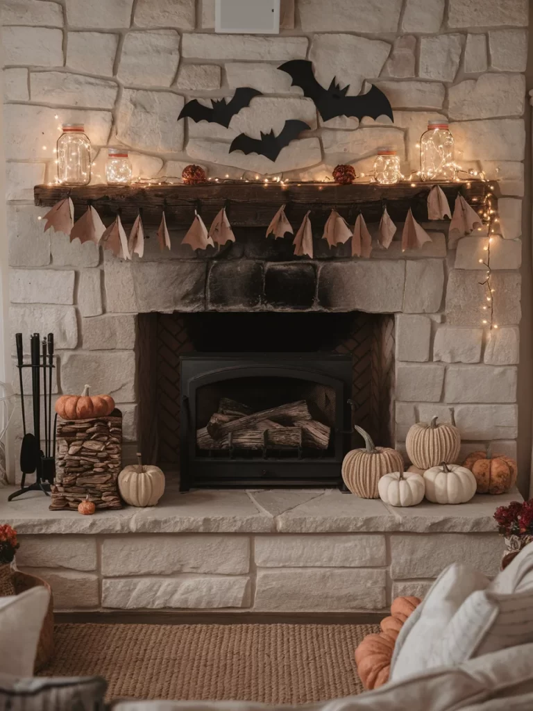 This stone fireplace creates a romantic Halloween atmosphere with warm fairy lights strung along the mantel. Mason jars with lights, a kraft paper triangle garland, and black bat silhouettes on the wall combine rustic and spooky elements. The neutral color palette keeps it sophisticated while maintaining Halloween spirit.
