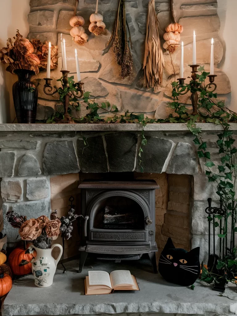 A stone fireplace showcases autumn decorating with dried corn husks, gourds, and natural elements. Wrought iron candelabras with white candles create dramatic lighting, while ivy trails down the sides. A black cat decoration and open book add Halloween touches to this rustic, harvest-inspired display.