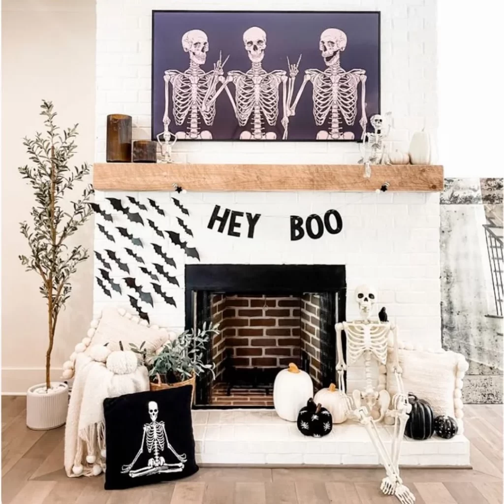 This modern Halloween setup features three skeletons making peace signs in a framed artwork above the mantel. The white fireplace is decorated with cascading black paper bats, “HEY BOO” lettering, and a full skeleton positioned beside the hearth. White and black pumpkins, along with cozy throw blankets, create a playful yet sophisticated Halloween atmosphere.