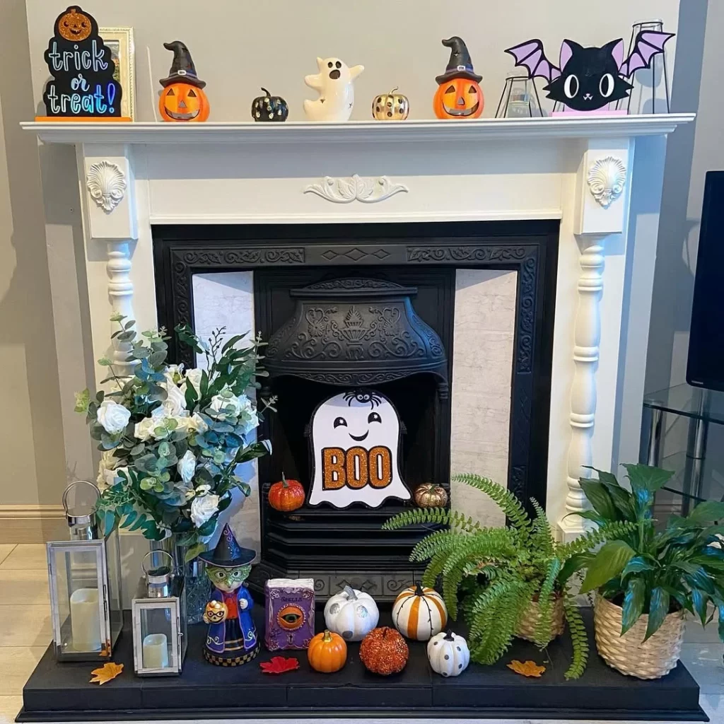 This charming fireplace display celebrates Halloween with a collection of cute character decorations across the white mantel. Jack-o’-lanterns, ghosts, witches, and a bat character create a friendly Halloween village scene. The ornate black fireplace insert contrasts beautifully with the white surround, while pumpkins and seasonal greenery on the hearth complete this family-friendly approach to Halloween decorating.
