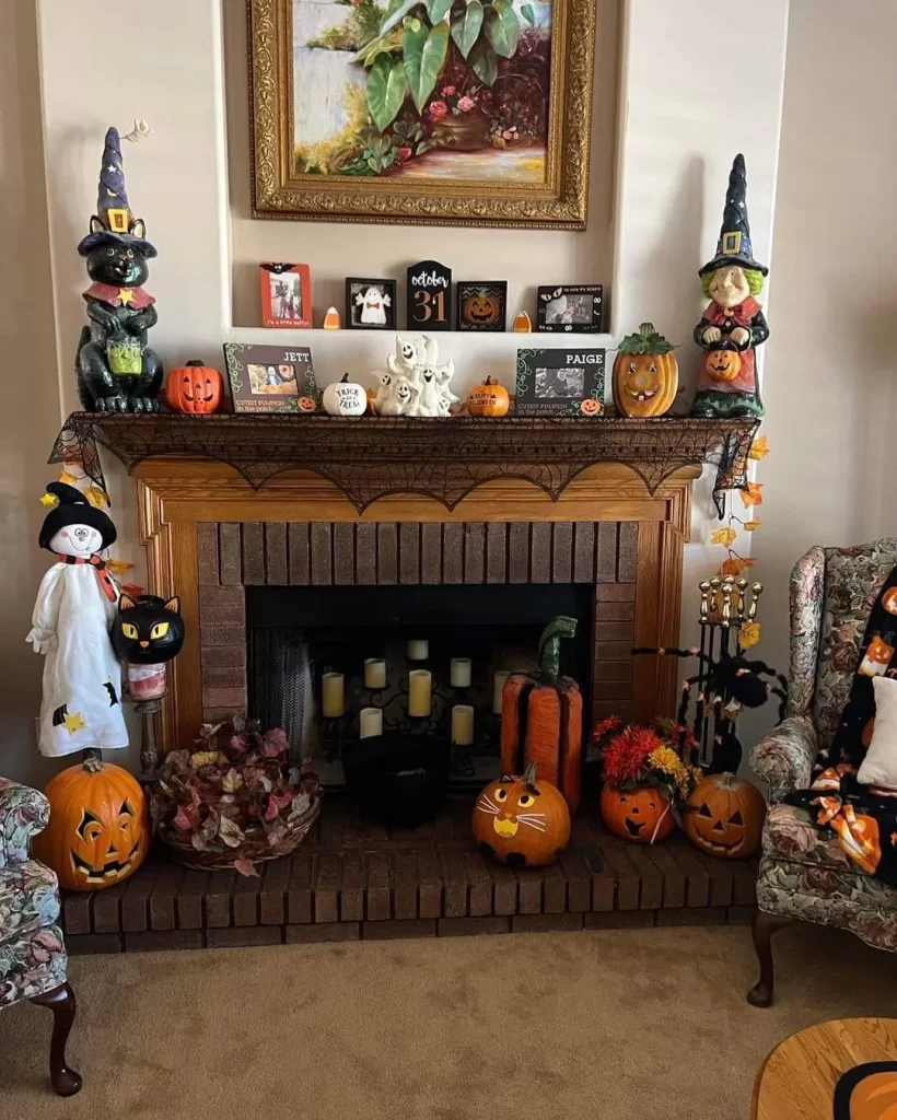 This charming setup transforms a traditional wood-paneled fireplace into a Halloween wonderland. The mantel overflows with an eclectic collection of Halloween figurines, including witch characters, jack-o’-lanterns, ghosts, and seasonal decorations. A black lace valance adds gothic elegance, while carved pumpkins and autumn leaves fill the hearth area. This maximalist approach is perfect for Halloween enthusiasts who love to display their entire collection.
