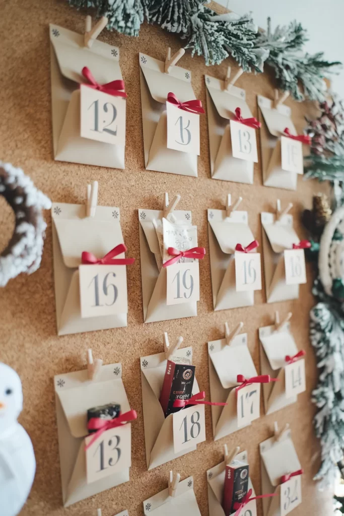 Materials: 25 small paper bags, numbers 1-25, cork board, clothespins, artificial garland, red ribbon, small treats