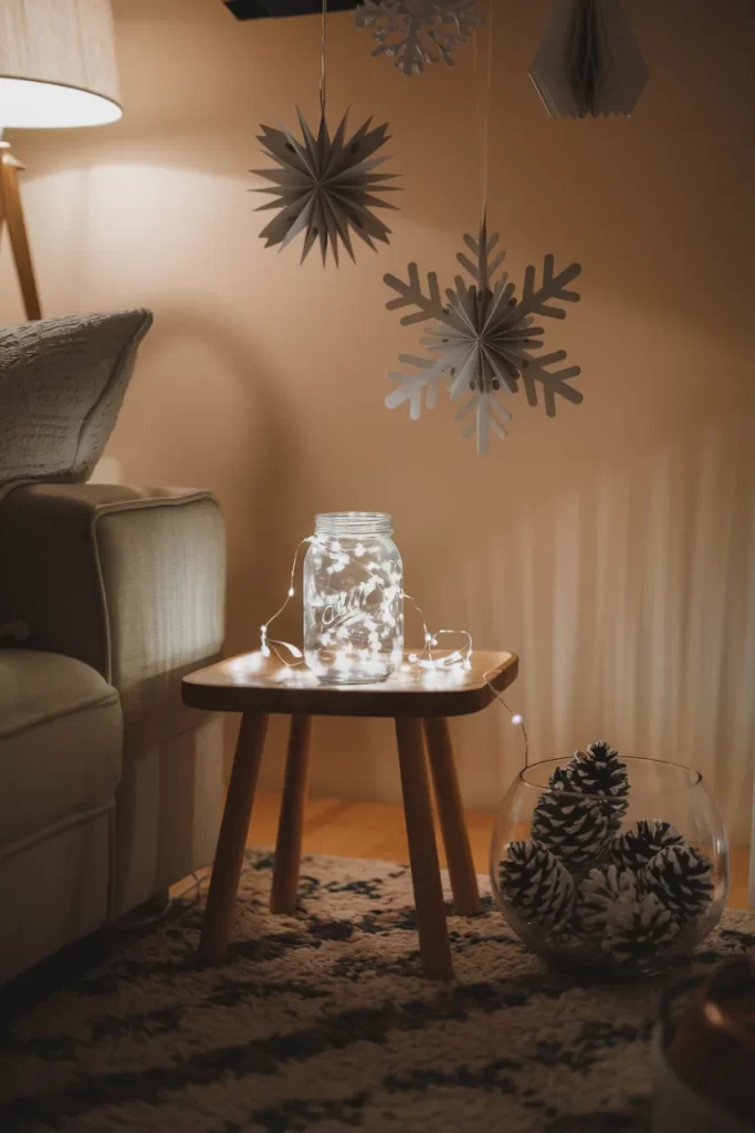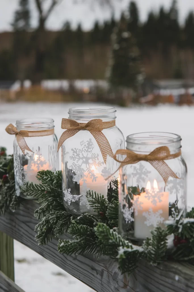 Materials: Mason jars, battery tea lights, white paper snowflakes, gold ribbon, evergreen sprigs Steps: