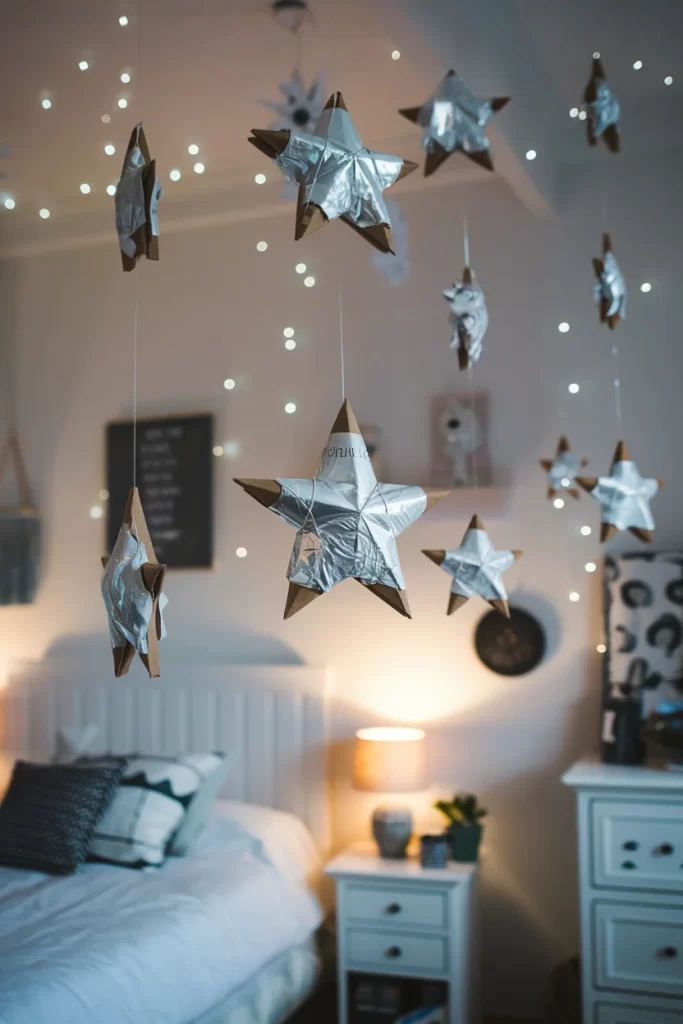 - Attach stars to ceiling at different heights using small hooks or tape