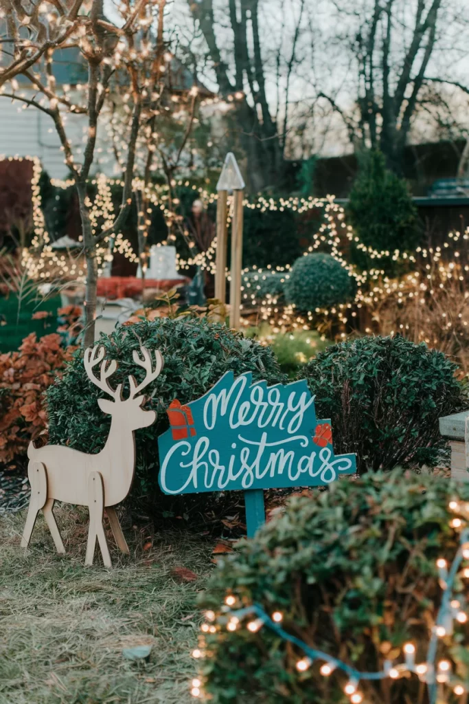 Materials: Wooden reindeer cutout, “Merry Christmas” sign, string lights, evergreen shrubs Steps: