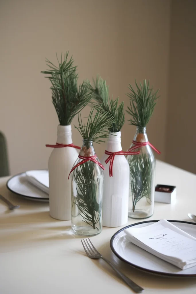 Materials: Glass bottles of various sizes, pine branches, red ribbon, white paint or spray Steps: