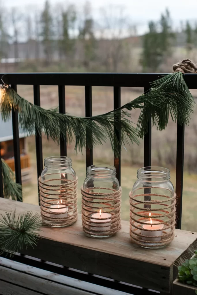 Materials: Mason jars, natural rope or twine, battery-operated tea lights, pine garland Steps: