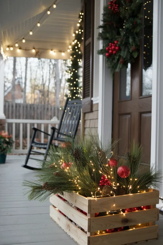 Materials: Wooden crate, pine branches, red ornaments, pine cones, battery string lights Steps: