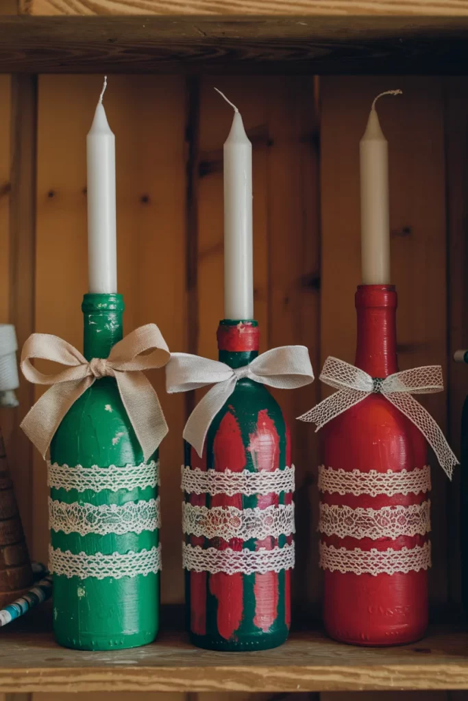 Materials: Empty wine bottles, acrylic paint (red and green), lace trim, ribbon, taper candles Steps: