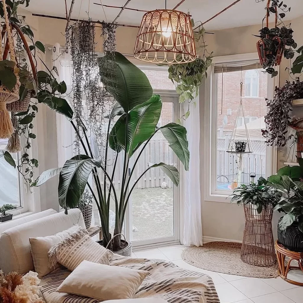 Perhaps the most dramatic display, this space features an extensive overhead hanging garden with multiple plants suspended from a grid system. Large tropical plants anchor the ground level while the ceiling becomes a canopy of trailing vines and hanging planters. The natural fiber lighting and woven basket planters enhance the boho-chic aesthetic.