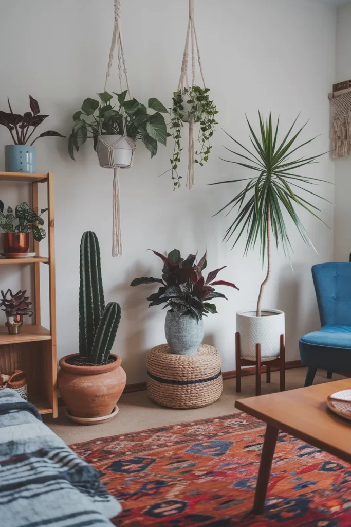 This eclectic arrangement showcases multiple styling techniques in one space. Macrame hangers suspend plants at different heights, while floor plants in varied containers create depth. A dramatic dracaena adds architectural interest, and the mix of plant types – from trailing to upright – creates texture and movement. The layered approach with different elevations maximizes visual impact in the available space.